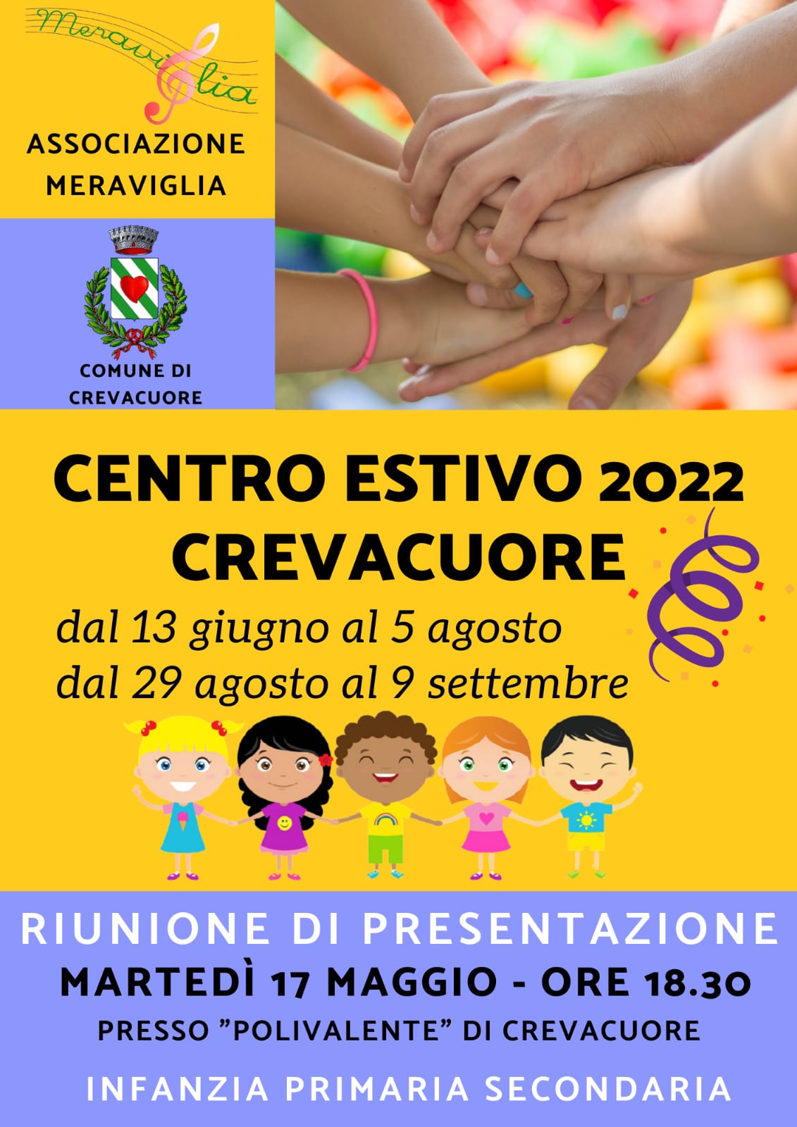 Il Comune di Crevacuore in collaborazione con l’Associazione Meraviglia, organizza il Centro Estivo per l’estate 2022 per la scuola dell'infanzia, la scuola primaria e la scuola secondaria, dal 13 giugno al 5 agosto e dal 29 agosto al 9 settembre 2022.