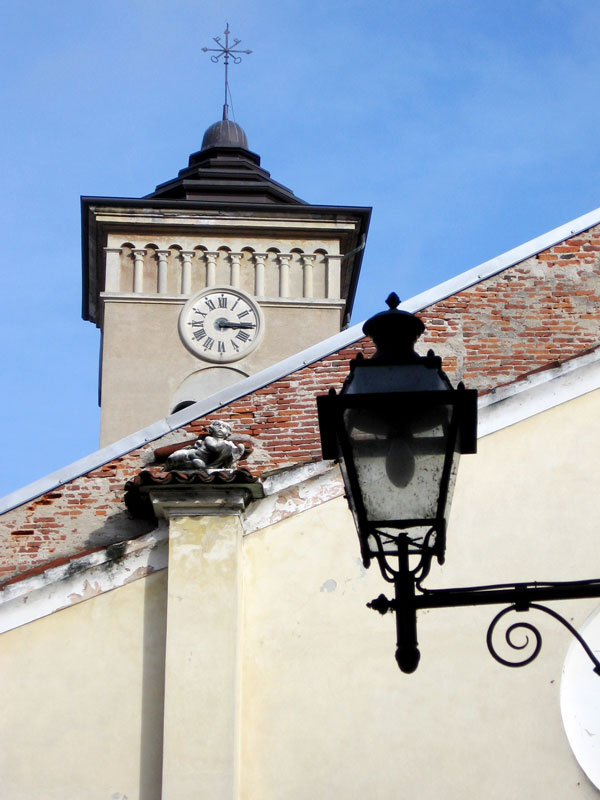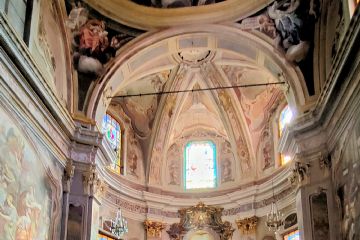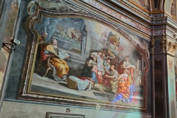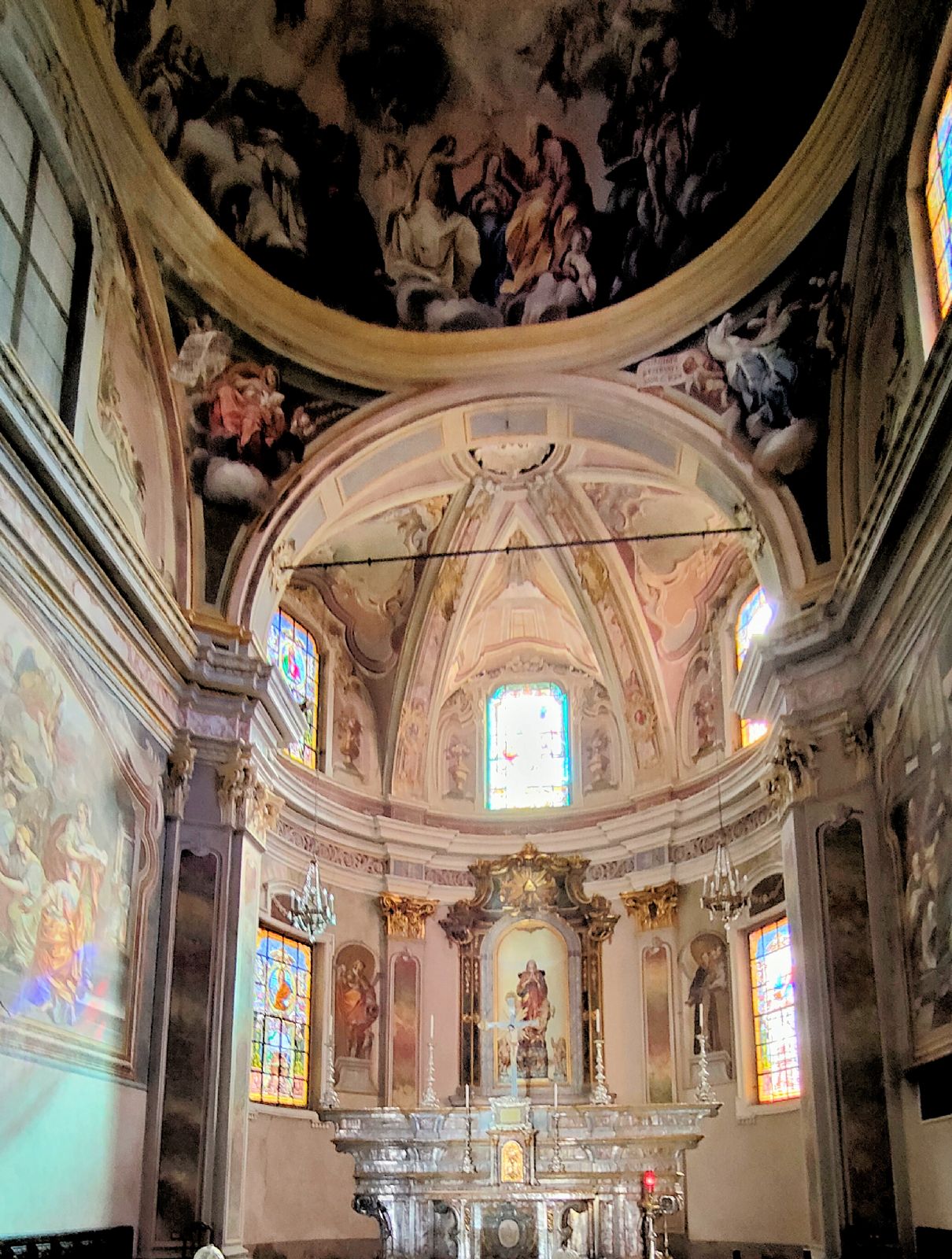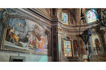Sono presenti preziosi affreschi laterali e sulla volta attribuibili a Joahnnes (Jan) Tanisch (1736-1737) che rappresentano personaggi femminili dell'Antico testamento (la regina Ester, Giaele che uccide Sisara, Giuditta con la testa di Oloferne) ed una bella tavola "Madonna col Bambino, Santi e donatori" di Ottaviano Cane, (1534-35 ca.).